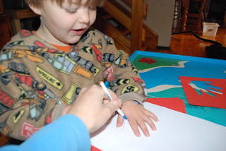 Trace around kid's hands - once on the red cardboard and twice on the white cardboard. Cut out.